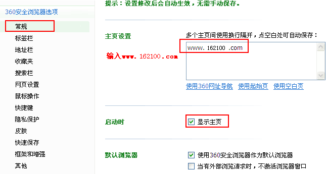 2)然后在打开的对话窗口中的主页设置的地址输入框中输入“https://wz.1608.cn/”设置修改后会自动生效,无需手动保存。如图所示: